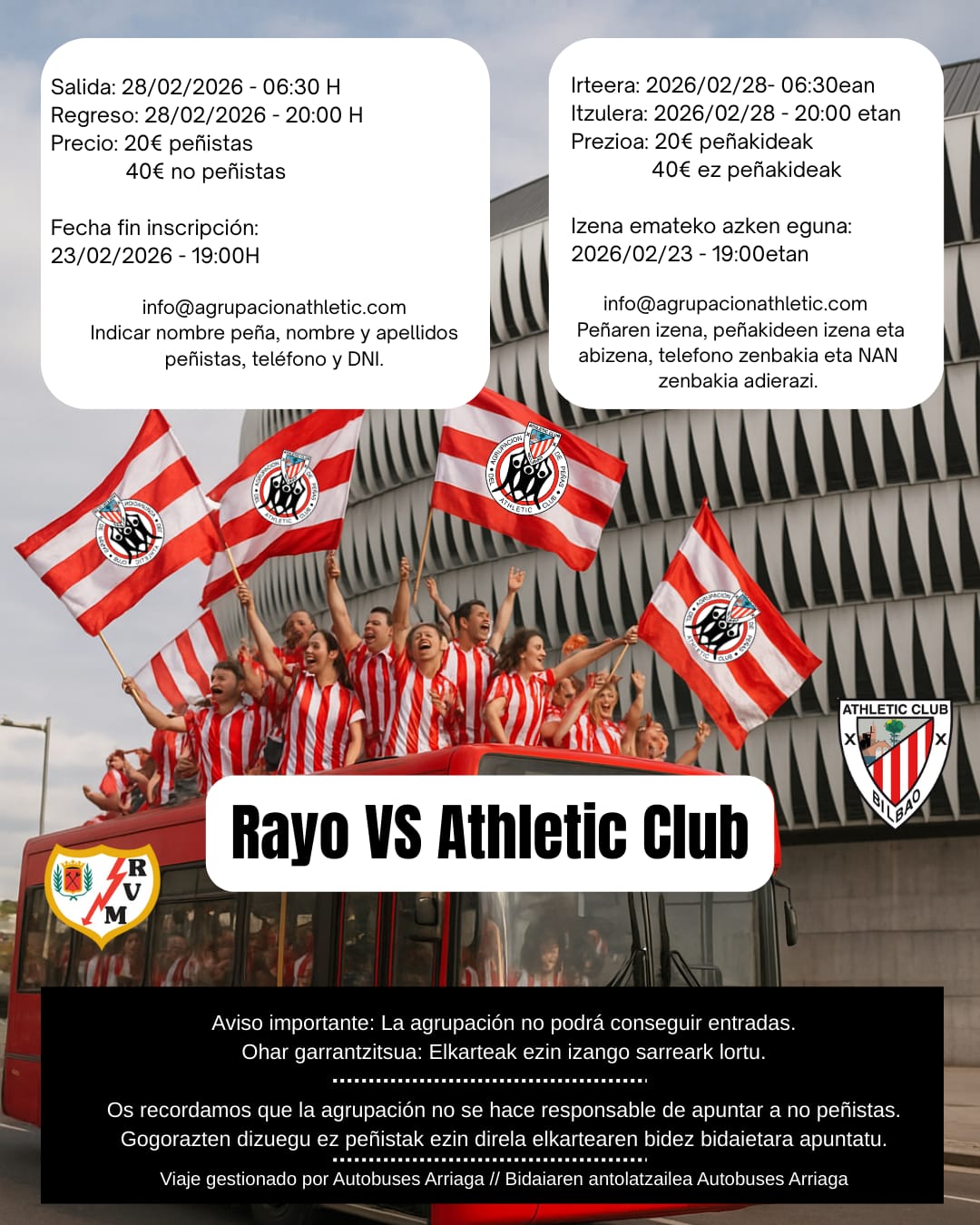 Desde la Agrupación se organizan viajes para acompañar al Athletic en sus partidos fuera de casa. Estos viajes pueden ser de ida y vuelta o con noche de hotel según el destino. Para poder viajar con nosotros es indispensable formar parte de una peña. Para mas info, ponte en contacto con nosotros o con alguna de nuestras peñas adheridas !!